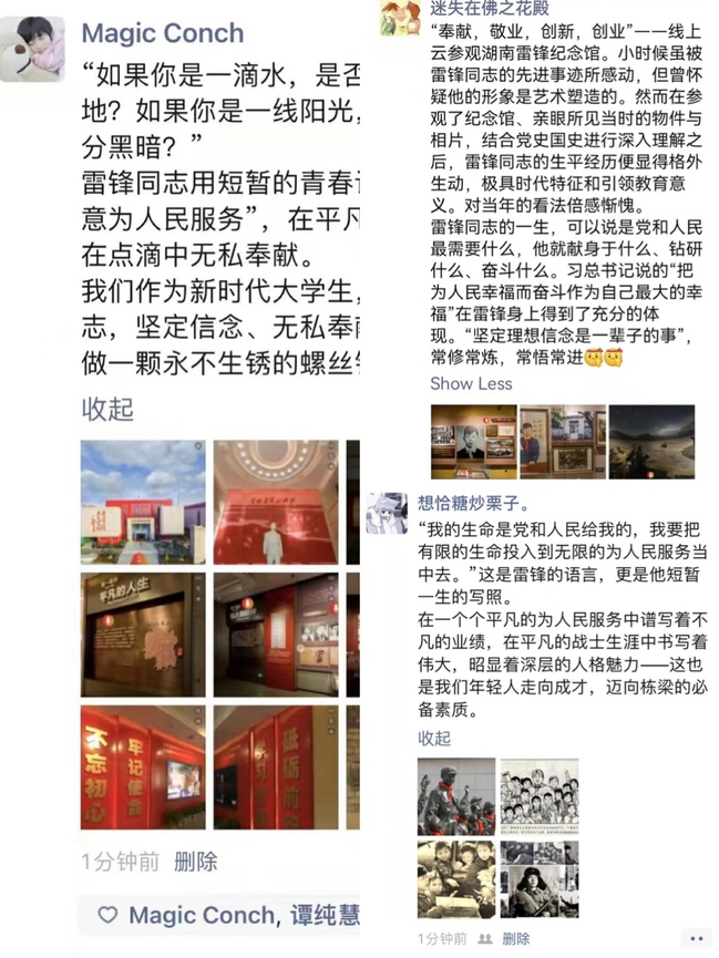 与此同时,学院学生通过云参观的方式走进了雷锋家乡长沙市望城区的湖南雷锋纪念馆。学生们通过阅读雷锋日记、寻访雷锋的成长足迹等方式,认识雷锋22年平凡而又不凡的人生,感悟雷锋精神的时代内涵,领略新时代雷锋精神的繁华硕果,并通过网络实时分享所思所想所得。