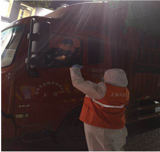 志愿者们的主要工作是引导驾驶员以及车上每一位乘客完成一份入沪身份登记。在穿戴好全套防护服以及口罩护目镜后,陈学勤就与其他志愿者们一起开始了工作。在凌冽的寒风中,他们穿梭在一辆又一辆车辆间,耐心地与不同人员沟通。
