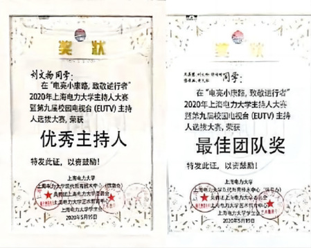 刘文扬说自己曾恐惧上台表演,为了克服在大家面前说话的恐惧,在疫情期间他参加了线上的主持人大赛。通过线上预演、个人才艺、临场主持展示等环节获得了校优秀主持人和最佳团队奖。