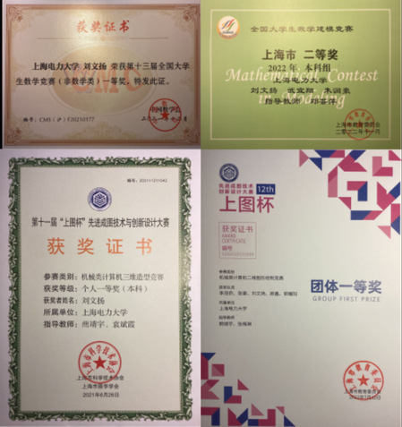刘文扬一直对理科比较感兴趣,完成高等数学的课程后,并没有停止对数学的学习。每学期都报名参加学校开设的高等数学选讲与提升课程,还报名参加全国大学生数学竞赛。第一次参赛与获奖失之交臂,“我总是不服输的,既然决定要参加比赛,就一定要留下点成果。”他和同学组成学习小组,不断挑战,终于在2021年12月获得了全国大学生数学竞赛全国一等奖。除此以外,还获得过“上图杯”先进成图技术与创新设计大赛的个人一等奖(三维,2021年)、团体一等奖(二维,2022年),“高教社杯”数学建模上海市二等奖,上海市学术物理竞赛三等奖等。