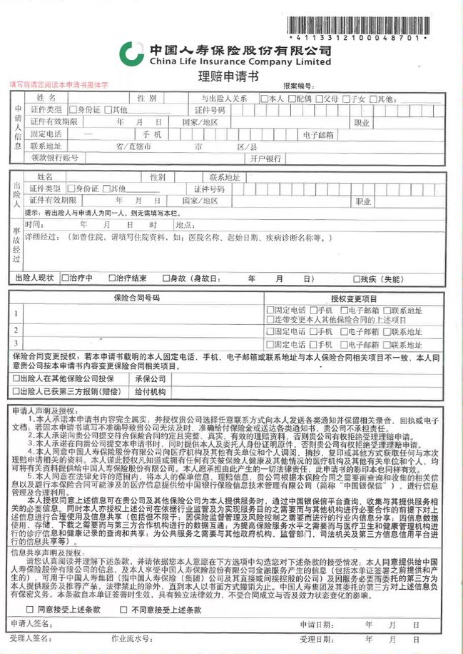 填项目:申请人信息栏(国家&职业&证件有效期、地址精确到XX路XX号)以及事故经过。