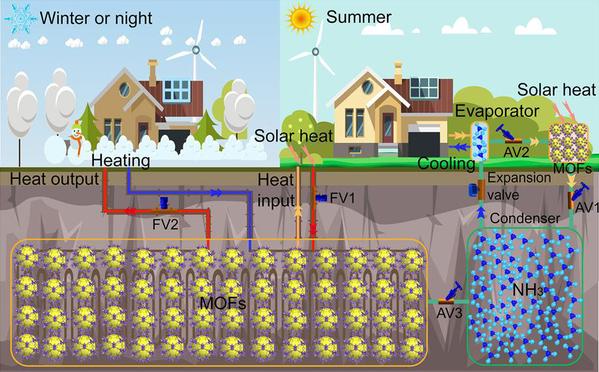 研究团队通过实验和计算结果设计了五种MOF-氨工质对,并构建了基于该工质对的闭式吸附循环分别评价了热泵、空调、制冰、长/短周期储热等场景下的性能,揭示了热能转换与储存性能、解吸温度、蒸发温度和吸附温度的内在关系。结果显示,MOF-氨工质对在低温环境的供热场景下具有显著性能优势,为极端气候下的实际应用提供了新思路。